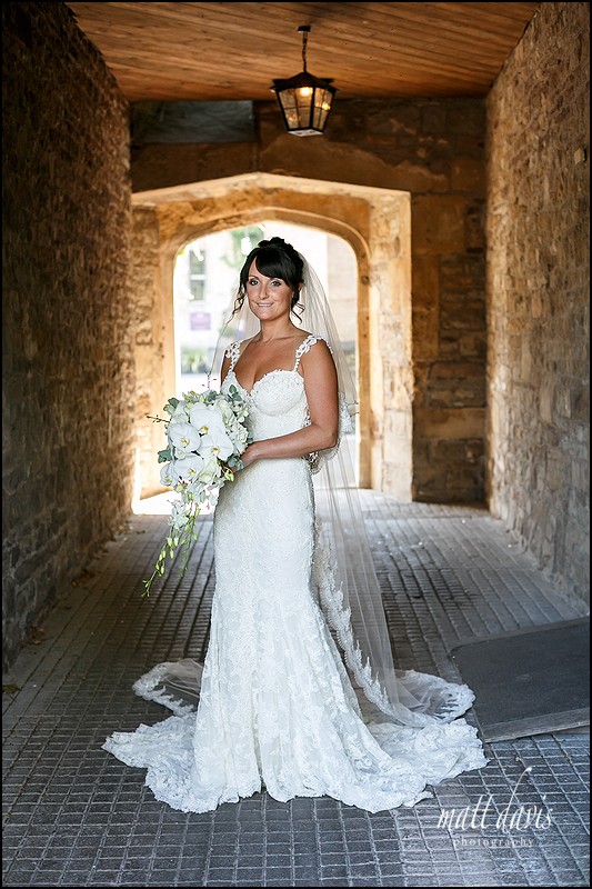 Love this wedding photo with such amazing light in the archway at Thornbury Castle.