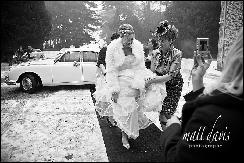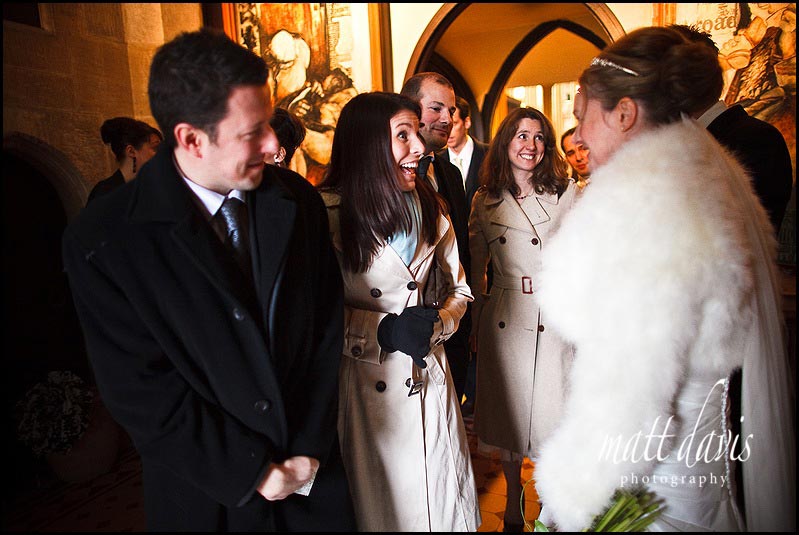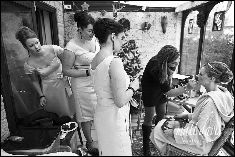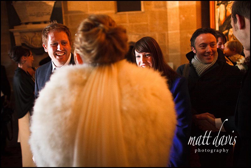 Winter weddings are becoming ever more popular, it’s a great time of year to get friends and family together and with wedding venues catering with a festive twist it’s certainly a nice idea. For a photographer it’s a totally different approach to that of a summers day, yet despite the lack of hot sunshine, the quality of light is usually far better to take photos in. The only problems are the getting to and fro, especially with the white winters we’ve had lately, and Dave & Lucy’s wedding was no exception. A light covering of snow had fallen, but thankfully it didn’t hamper progress, unless of course you’re wearing peep toe wedding shoes! It’s amazing actually how a winter wedding, despite being polar opposite in weather terms to that of a summer wedding, brides usually still wear the same outfit – a slinky white dress! I do pity the bridesmaids though as they don’t have the same ‘wedding high’ as a bride which somehow creates an inner warmth that negates the need for a coat.