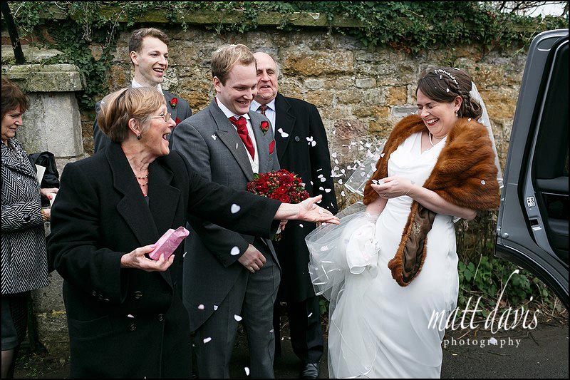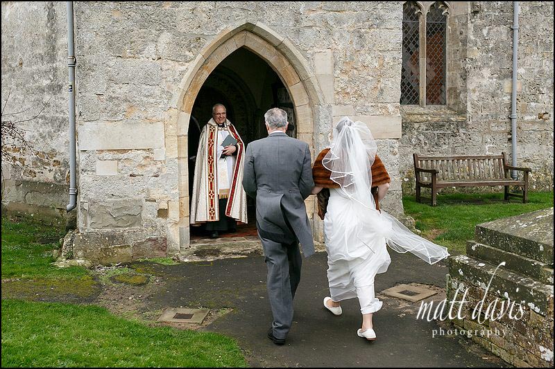 The wedding ceremony itself was at the nearby church of St John the Evangelist in Slimbridge, so as we neared crunch time I zipped off to catch up with the proceedings there and await Zoe’s arrival. After a few scene setting photos Zoe arrived and was blown along the church pathway into the main doors, whereby a quick wardrobe readjustment took place and she was then walking down the aisle.