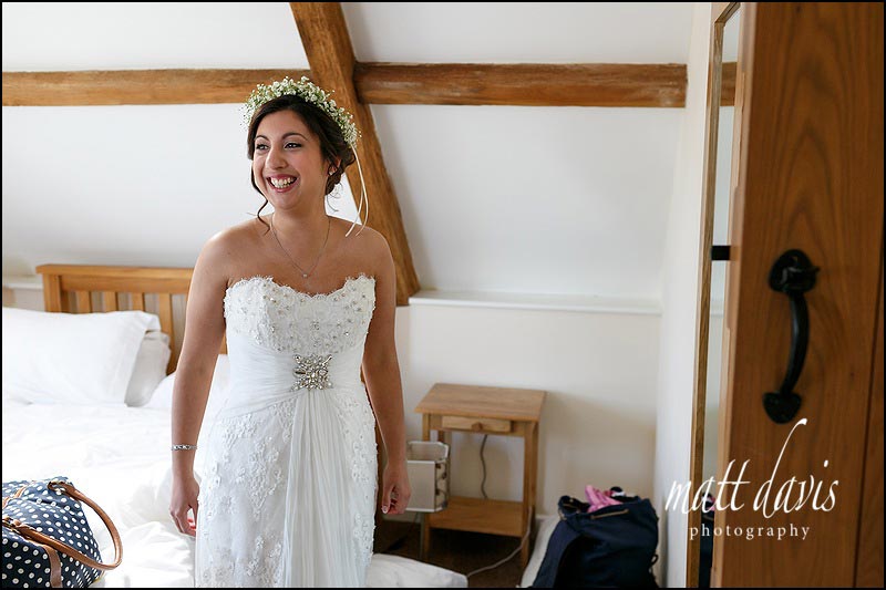 Smiley bride, clearly pleased with her flowery crown….or is it called a wedding headband? Anyone know?