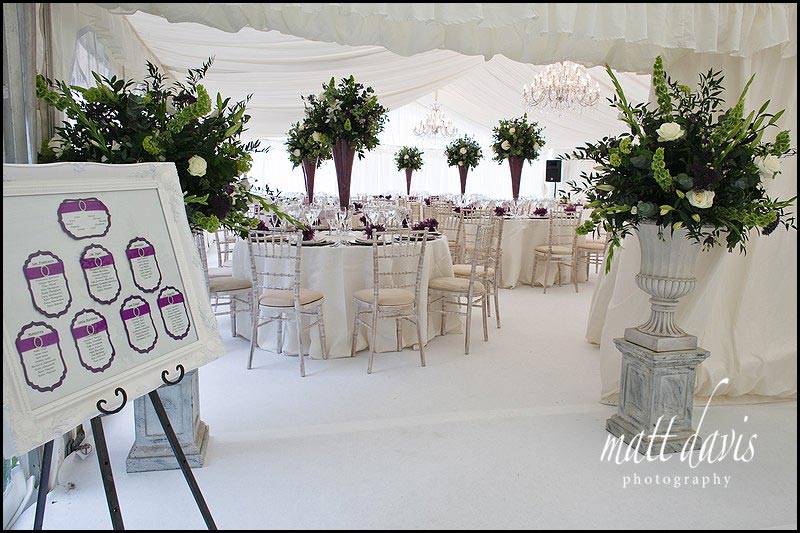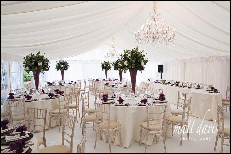 The wedding marquee looked fantastic, decorated with a purple theme.