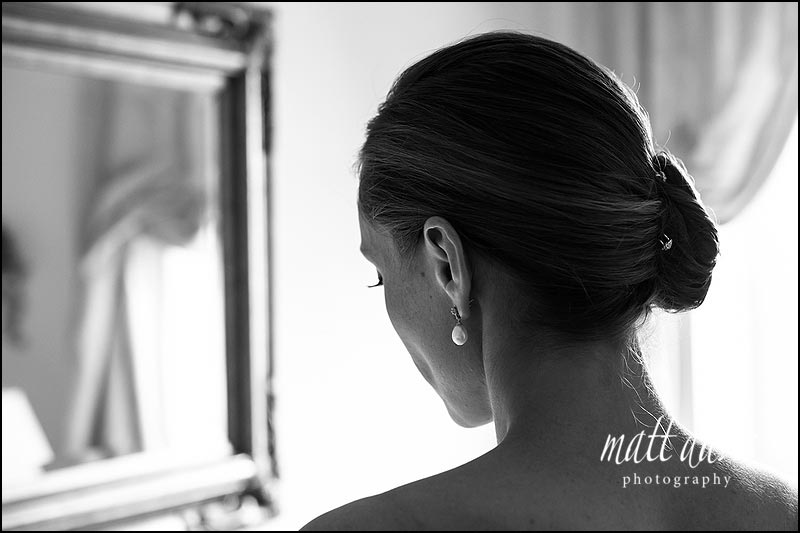 Delicate earrings complement the look with Antonia wedding hair tied to the side.