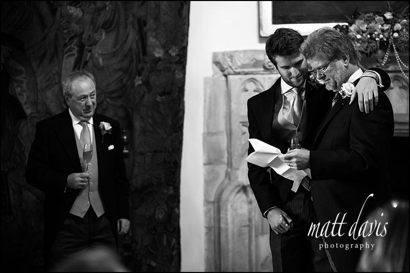 Wedding days are often emotional and non more so than Dominic & Jannene’s wedding at Berkeley Castle in September. A photo often works best as a set of images, and the above shot is one from a series taken during the speeches. At this moment, Dominic talked about loved ones who were no longer with us, and as you may expect found it hard to find the right words. The gesture of his son moving across to give support with a reassuring touch is what makes this photo extra special for me.