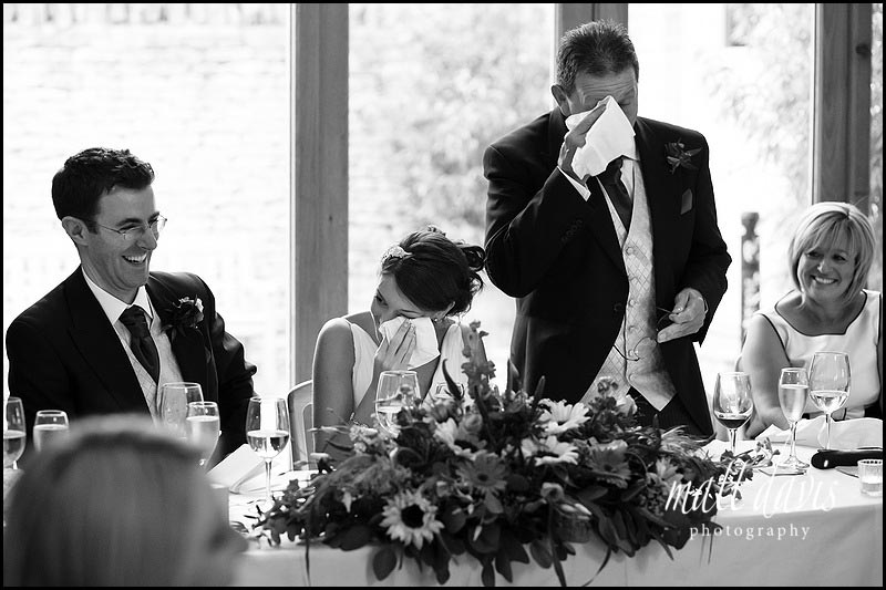 Wedding days are full of laughter and tears. Not often together, but this double act with hankies, flanked by the groom and MOB laughing work really well together. I also love the fact, (with respect to the wedding clothing), the scene reads from left to right as: black, white, black, white.