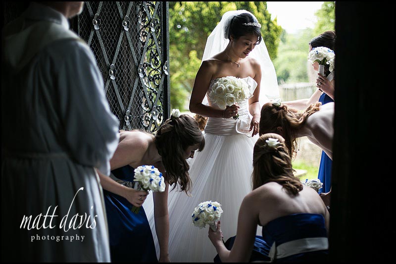 You’ll see me hang around by doorways (or window light) a lot as a photographer. The shot above is the prelude to the earlier photo from Kiki’s wedding entrance and has all the elements that form that moment just before you walk down the aisle. Attentive bridesmaids are seeing to the wedding dress. Flowers are at hand and the vicar has come to greet the bride.