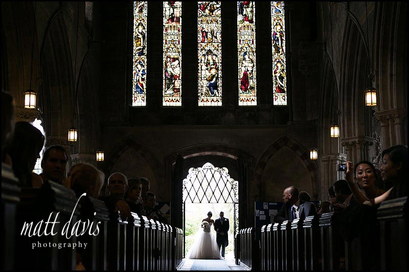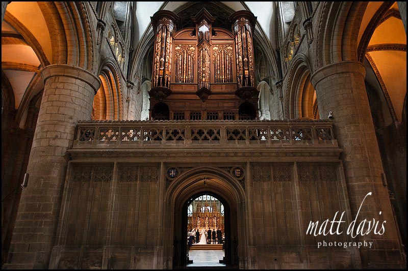 Producing variety in wedding photos is important for me. I always work alone, yet achieve this by covering as many angles as possible, combined with a mixture of compositions. This was taken at a typically non-eventful time during the ceremony, hence I was able to step away from what was happening at the front of the church, to set the scene of the wedding ceremony in it’s environment (in this case Gloucester Cathedral).