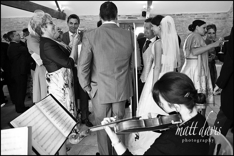 A significant part of every wedding day should be spent enjoying time with your guests. Photographing the drinks reception is really enjoyable for me, I get to move amongst your guests and build a portfolio of pictures that give a real feel for the day. This photo catches many of those elements all in one frame. In the foreground you have the violinist, part of a string quartet, who were playing throughout the drinks reception. Behind a bride and her father posing for a photo, whilst chatting to guests. And surrounding all of this are friends and family….with a drink in their hand!