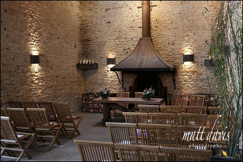 Inside Cripps Stone Barn with the wedding ceremony set in front of the main fire.